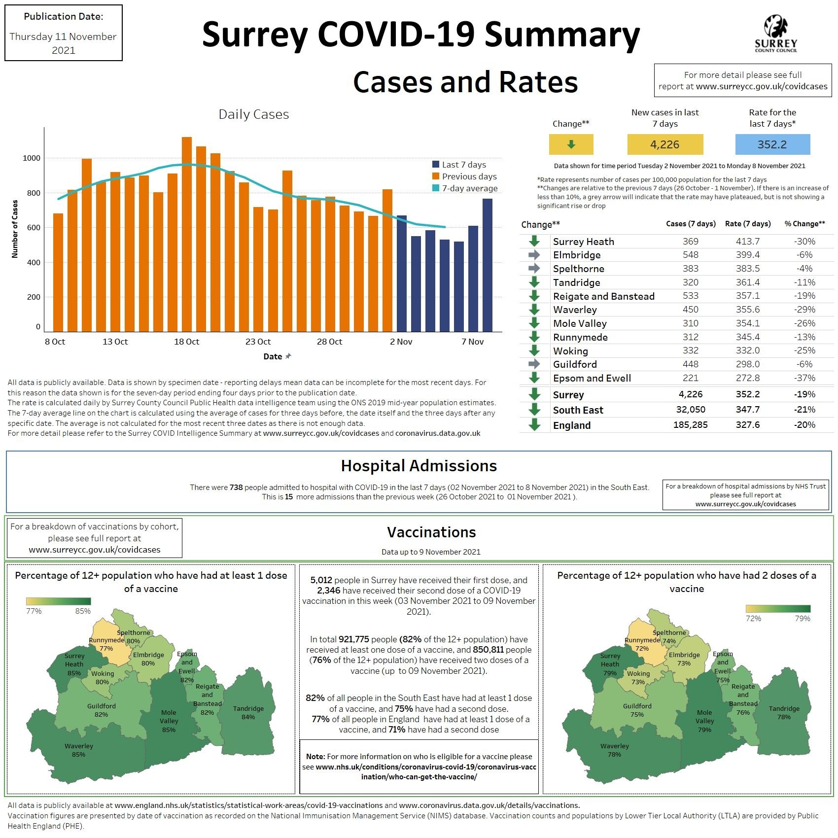 Today’s dashboard shows that Covid rates have decreased slightly, but they are still very high. Surrey’s overall infection rate is higher than the England average. As we head into winter it is vital that we stop the spread of the virus.
