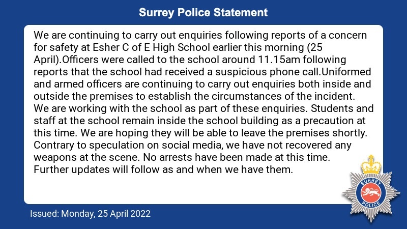 We are continuing to carry out enquiries following reports of a concern for safety at #Esher C of E High School earlier this morning: