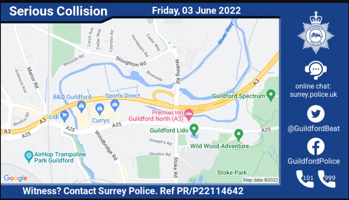 A woman has sadly died following a 2 vehicle collision on the A3 nr Stoke slip rd in #Guildford 2.50am today 3/6. Rd fully reopened after being closed for several hours. DM us w/info or dashcam footage ref PR/45220058537